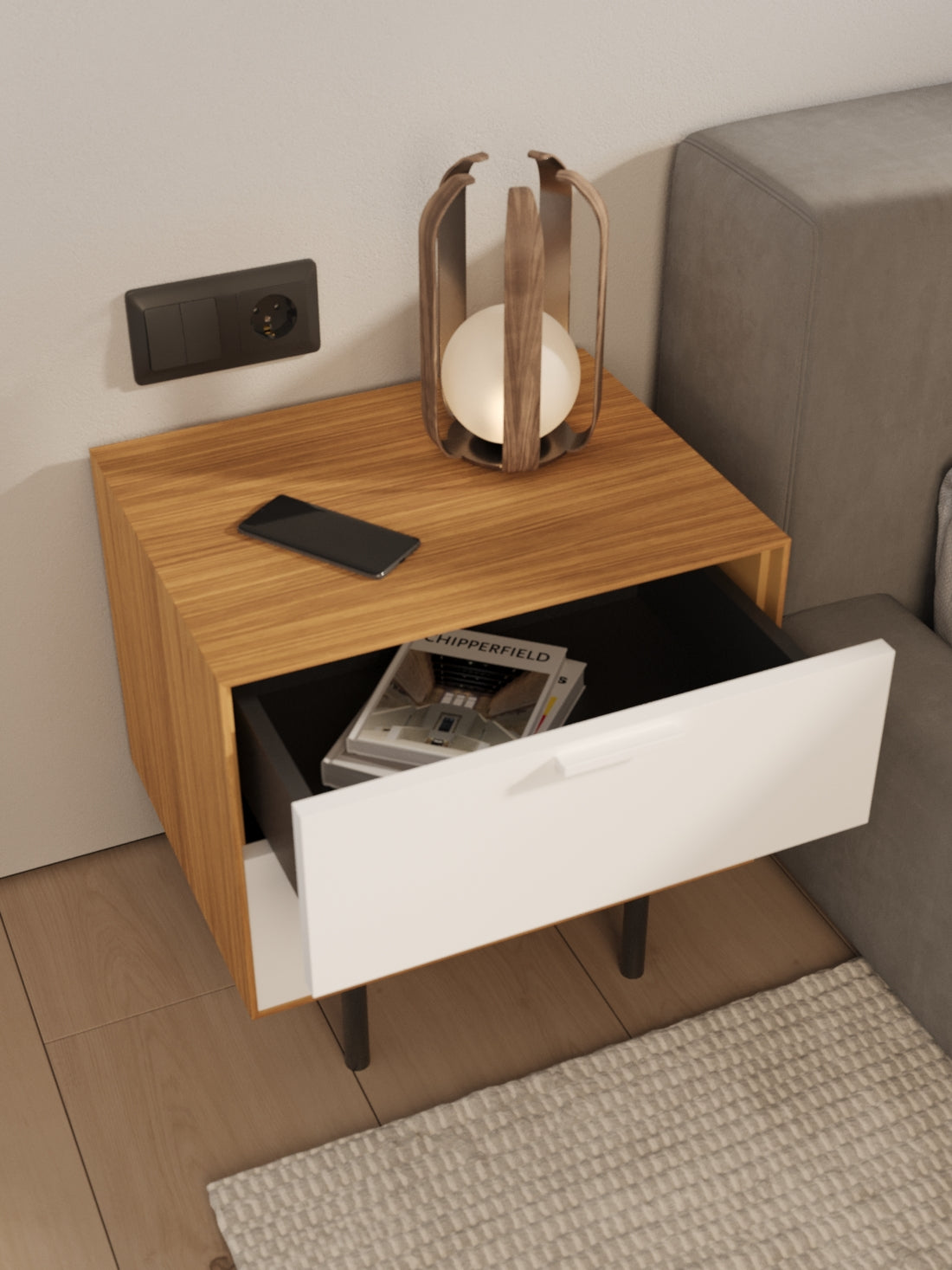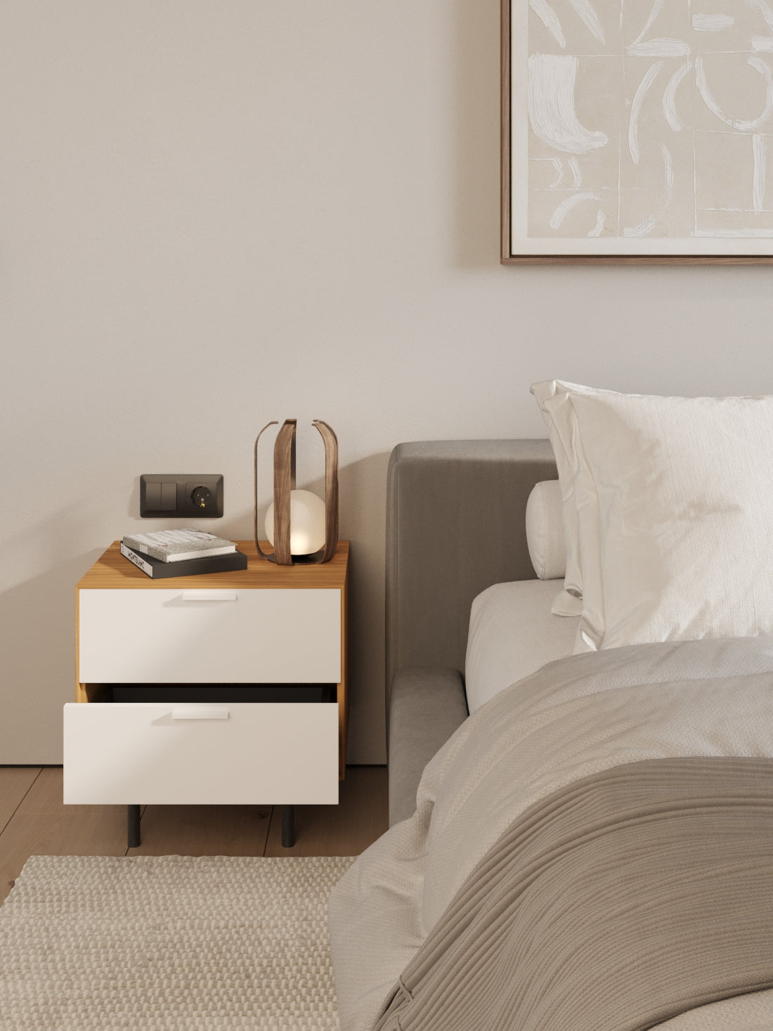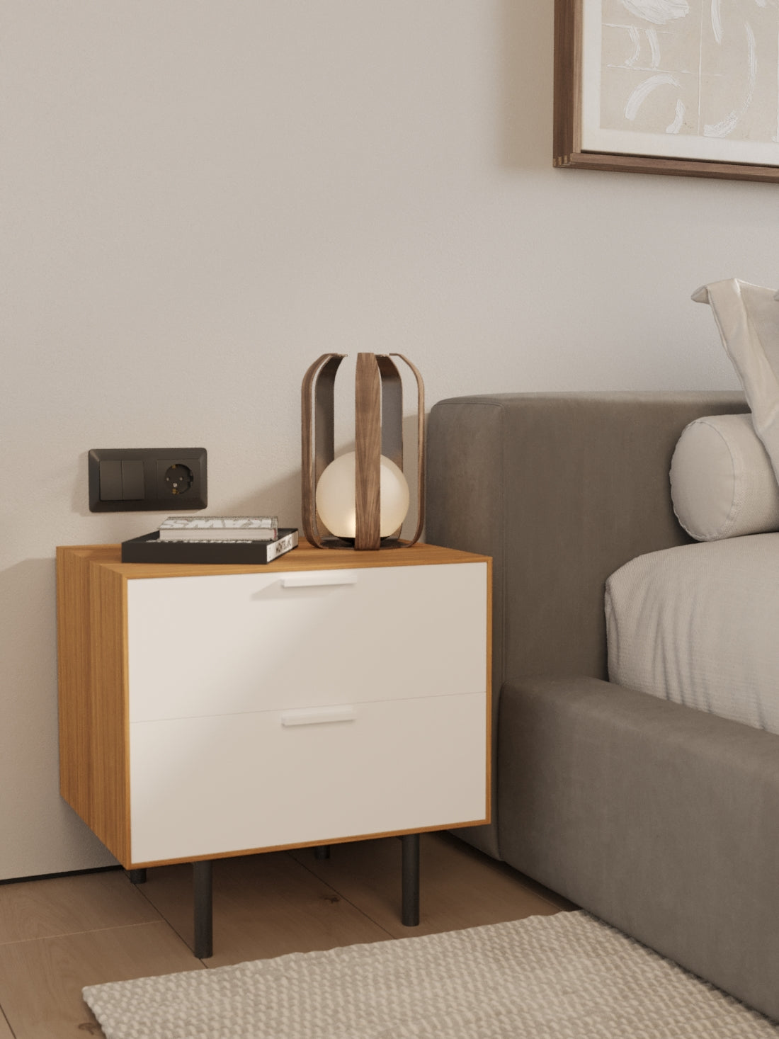 Mesita Erion 2 cajones en blanco con estructura y marco en roble natural y patas en grafito 50 x 48 x 40 cm