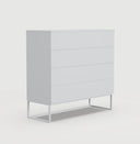 Cómoda de diseño contemporáneo en blanco mate, con cuatro cajones de apertura push y patas metálicas en epoxi a juego. Una pieza minimalista y elegante para el dormitorio.