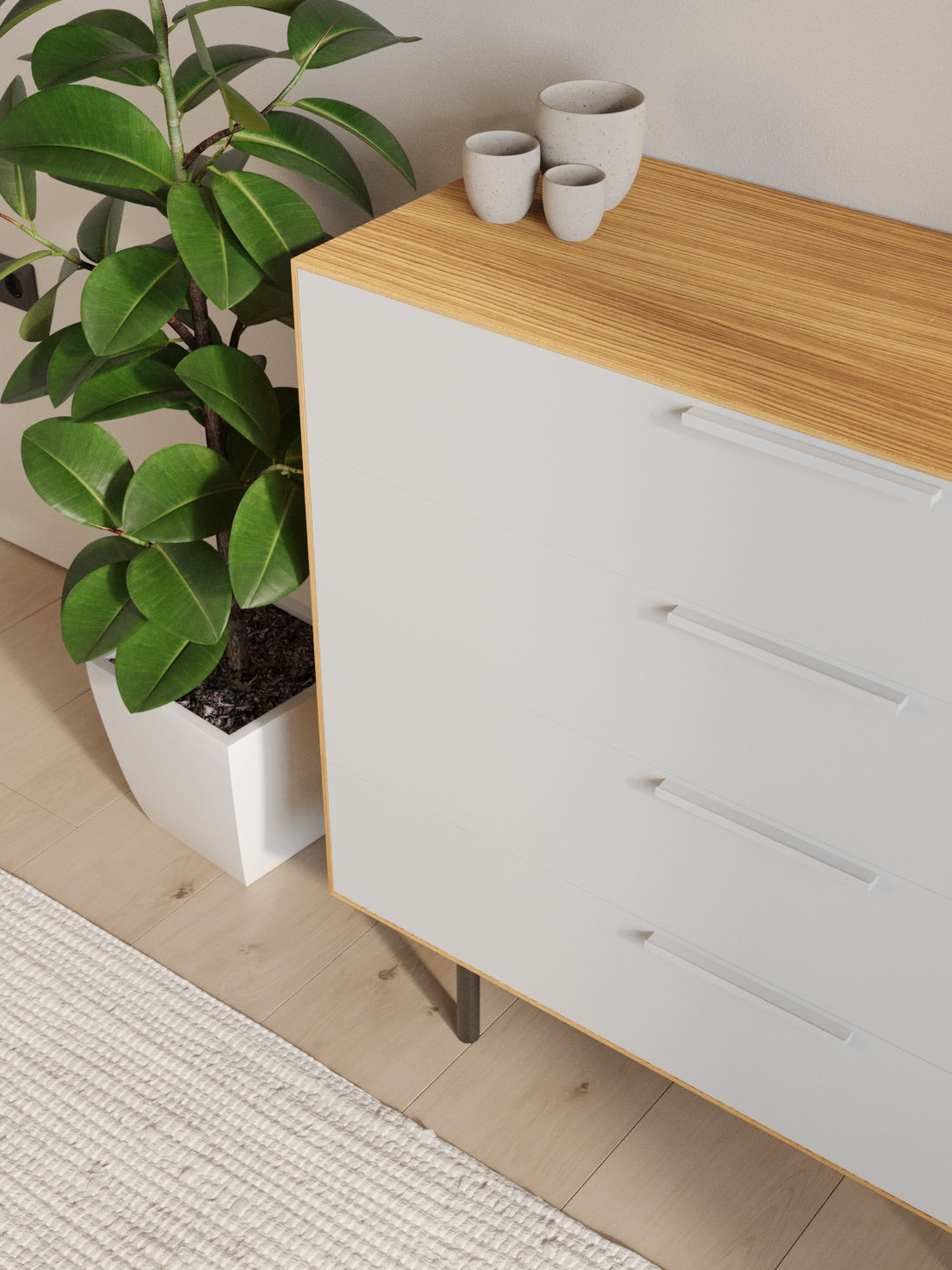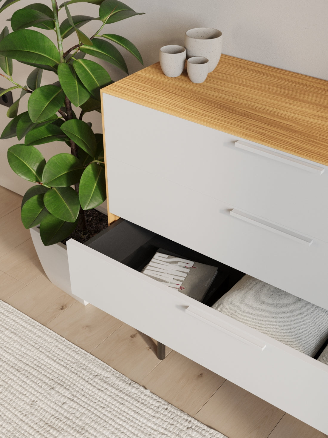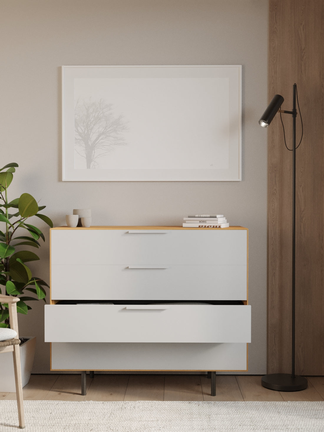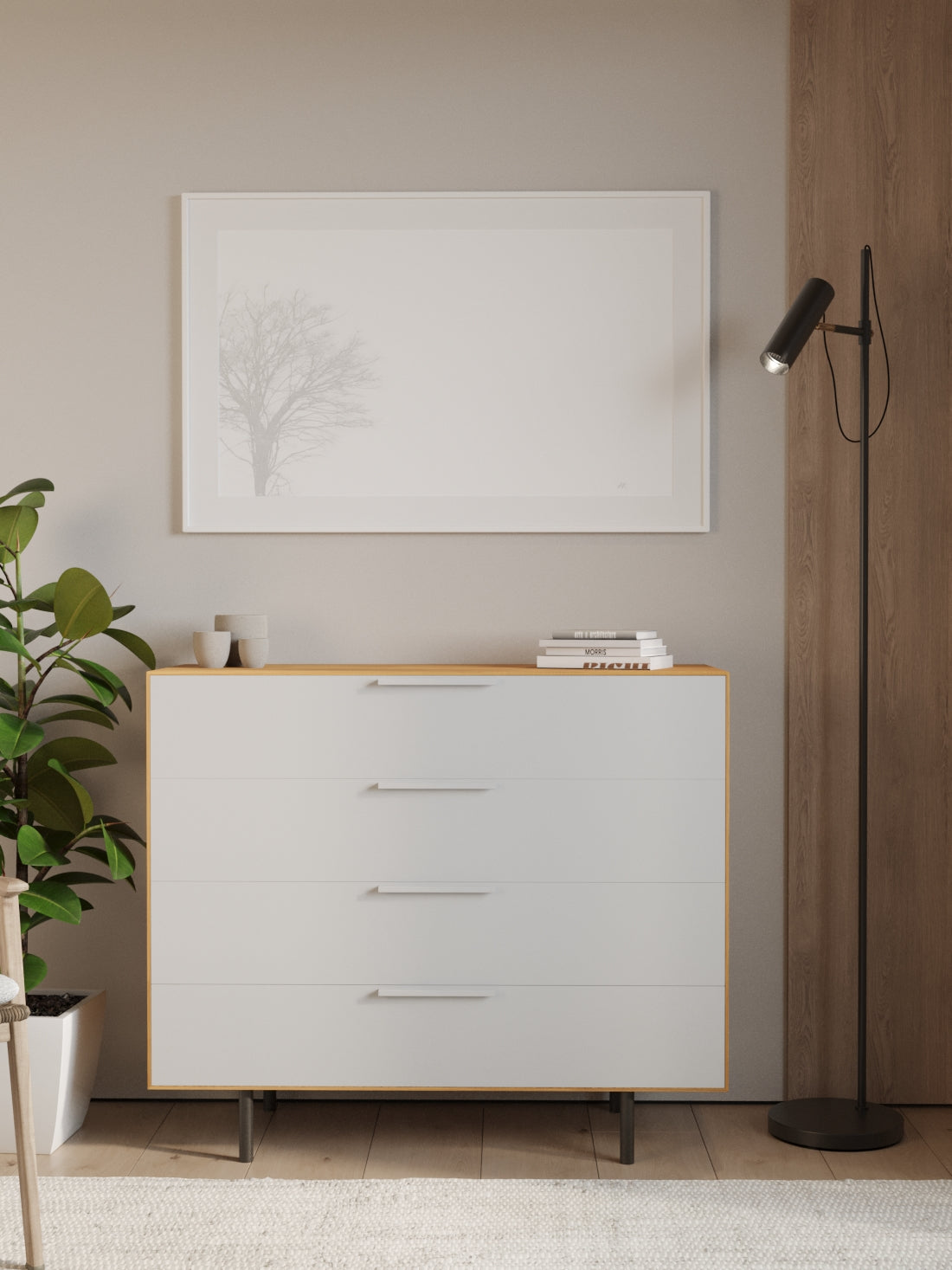 Cómoda Tessia 4 cajones en blanco con estructura en roble natural y patas en grafito 100 x 72 x 40 cm